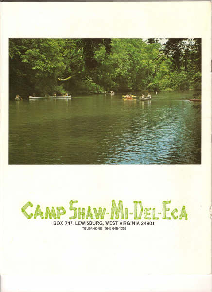 Camp Shaw-Mi-Del-Eca (the name is an abbreviation for four Indian tribes that existed in the region prior to the Nineteenth Century: Shawnee, Miami, Delaware, and Seneca) was operated as a Summer camp from 1929 througn 1978. From 1929 through 1971 it was operated as a Summer camp for boys by the Greenbrier Military School in Lewisburg, West Virginia U.S.A.--although, the Summer camp was not operated as a military camp[other military academies, such as the Valley Forge Military Academy in suburban Philadelphia(Wayne, Pennsylvania), does operate a Summer camp, which is a military-style camp]. In May of 1972, when the Greenbrier Military School went out-of-business (this news made the national media, including the NBC-TV "Today" show), it was also feared that Camp Shaw-Mi-Del-Eca would go out-of-business as well--only about a month and a half before the 1972 camping season was scheduled to begin! However, at the "last moment," Camp Shaw-Mi-Del-Eca was purchased and operated as a Summer camp for boys and girls by a local Lewisburg physician, Dr. Eugene McClung; an emergency letter was sent to recent camp attendees alerting them that the Camp would remain open. In 1978, a s Florida couple purchased the Camp and operated it for one year, before it closed permanently.