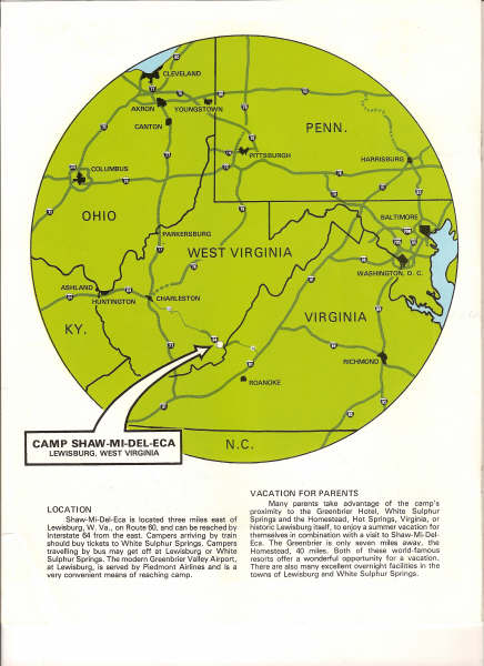 Camp Shaw-Mi-Del-Eca was located on the the eastern shore of the Greenbrier River, just outside of the little village of Caldwell, West Virginia U.S.A.; the even smaller village of North Caldwell (which was best known for a flea market each Saturday) is located on the western side of the Greenbrier River. The Camp location is three miles east of Lewisburg, the county-seat for Greenbrier County. The location is also six miles west of White Sulphur Springs, the location of the world-renowned resort called " The Greenbrier." The Greenbrier had been owned by the Chesapeake and Ohio Railroad, which constructed a passenger railroad station immediately across the street from the resort; this rairoad station is now used by the National Railroad Passenger Corporation (AMTRAK) for thrice-weekly passenger rail service to White Sulphur Springs from Washington, Cincinnati, and Chicago.
